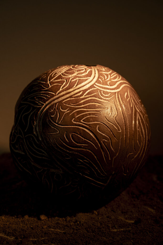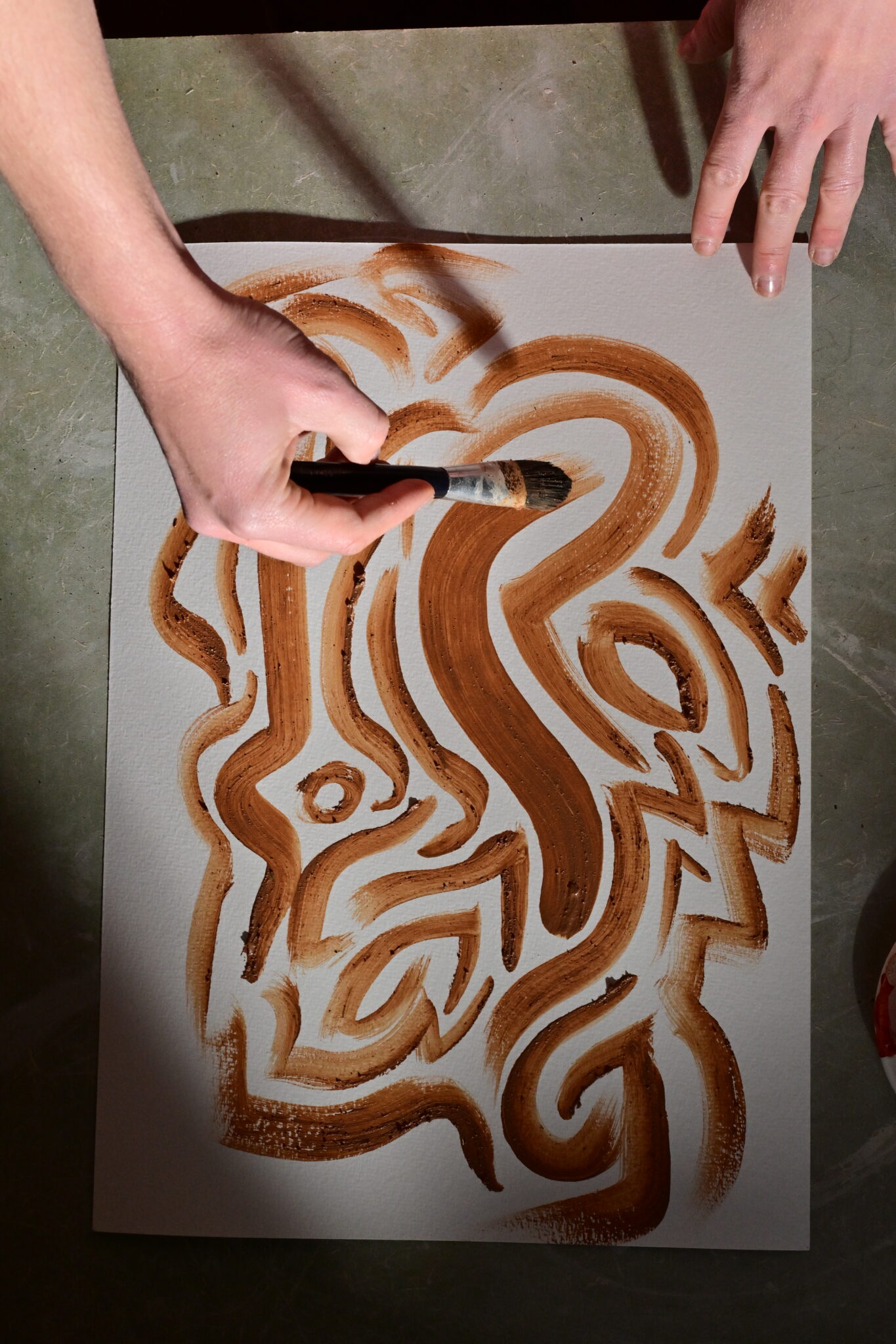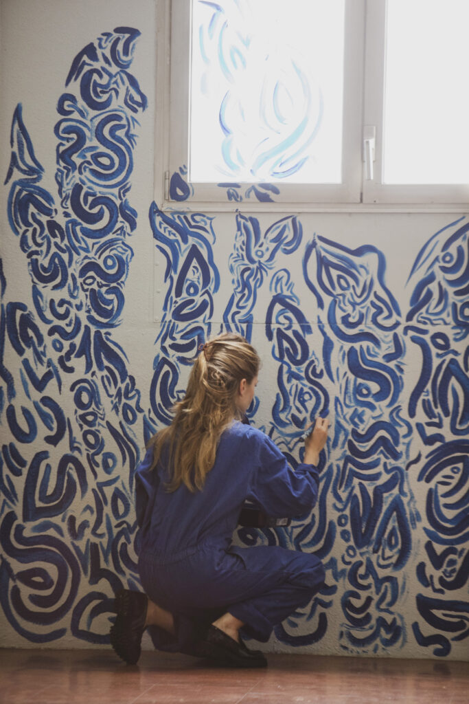 Ma démarche est une quête de signes. Je travaille à partir de formes qui se répètent, créant un univers de symboles géométriques qui me fascinent par leur force universelle. Au cœur de ce lexique, il y a La Flamme : un langage composé de symboles, répétés, entrelacés, que je grave comme une incantation sur la terre, les murs ou le tissu. Comme les nuages, il est une invitation au voyage, une paréidolie où l'on peut lire entre les lignes. À travers cette répétition, je cherche un langage commun, la vibration d'une histoire qui invite à l'imaginaire et nous relie toutes et tous.