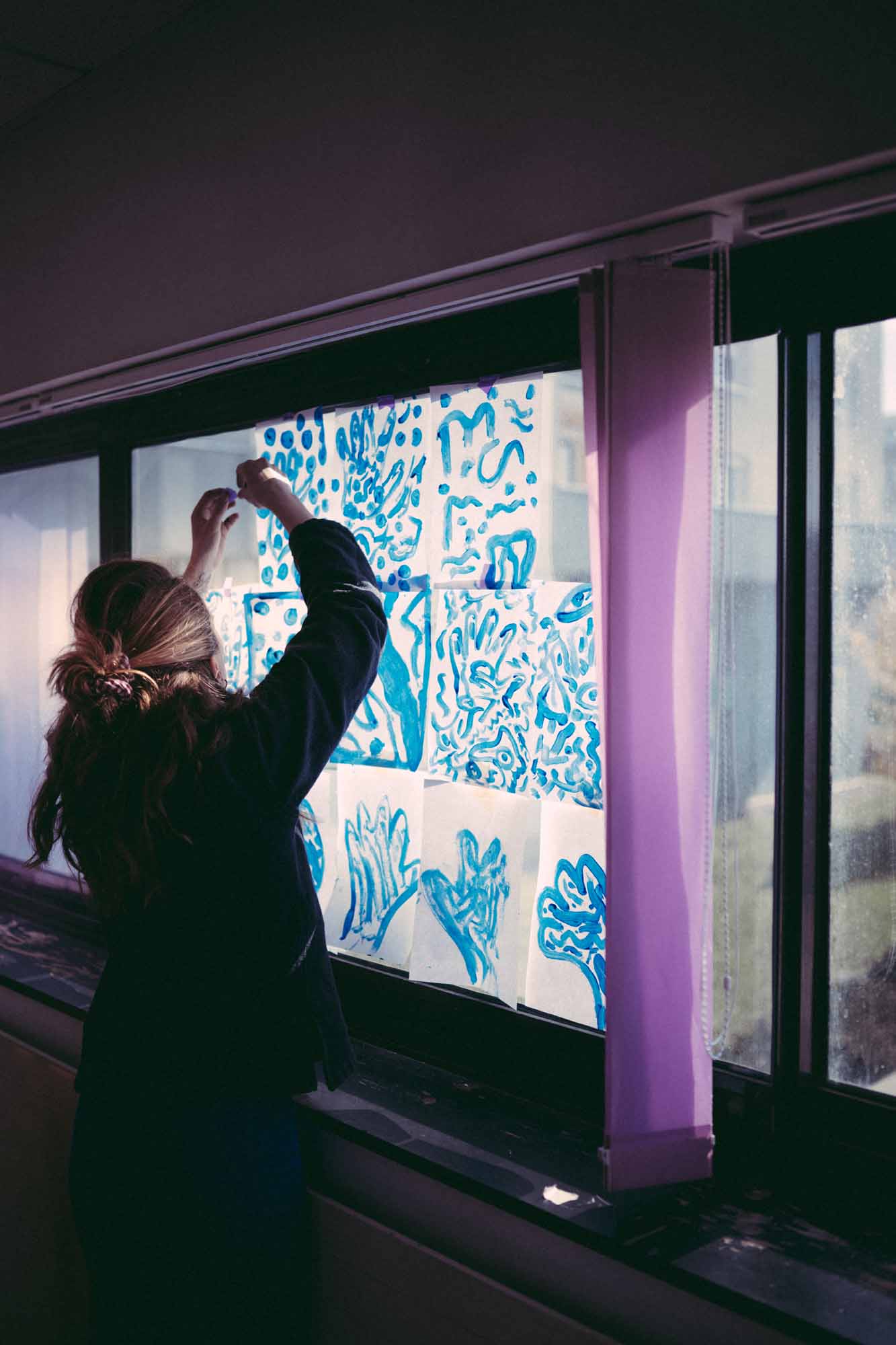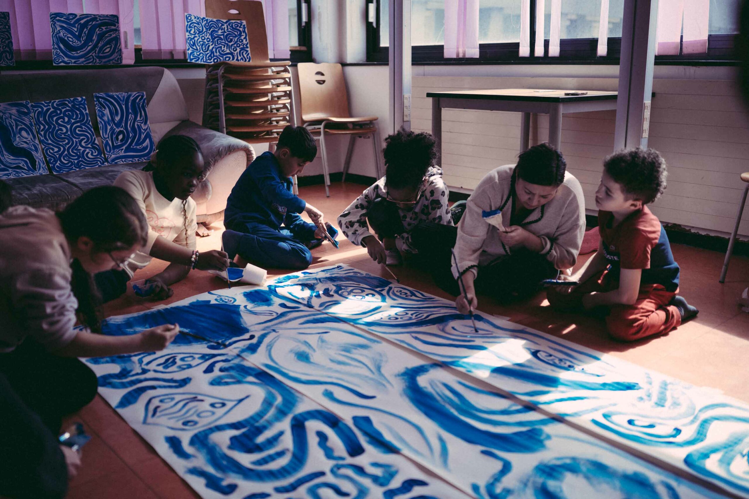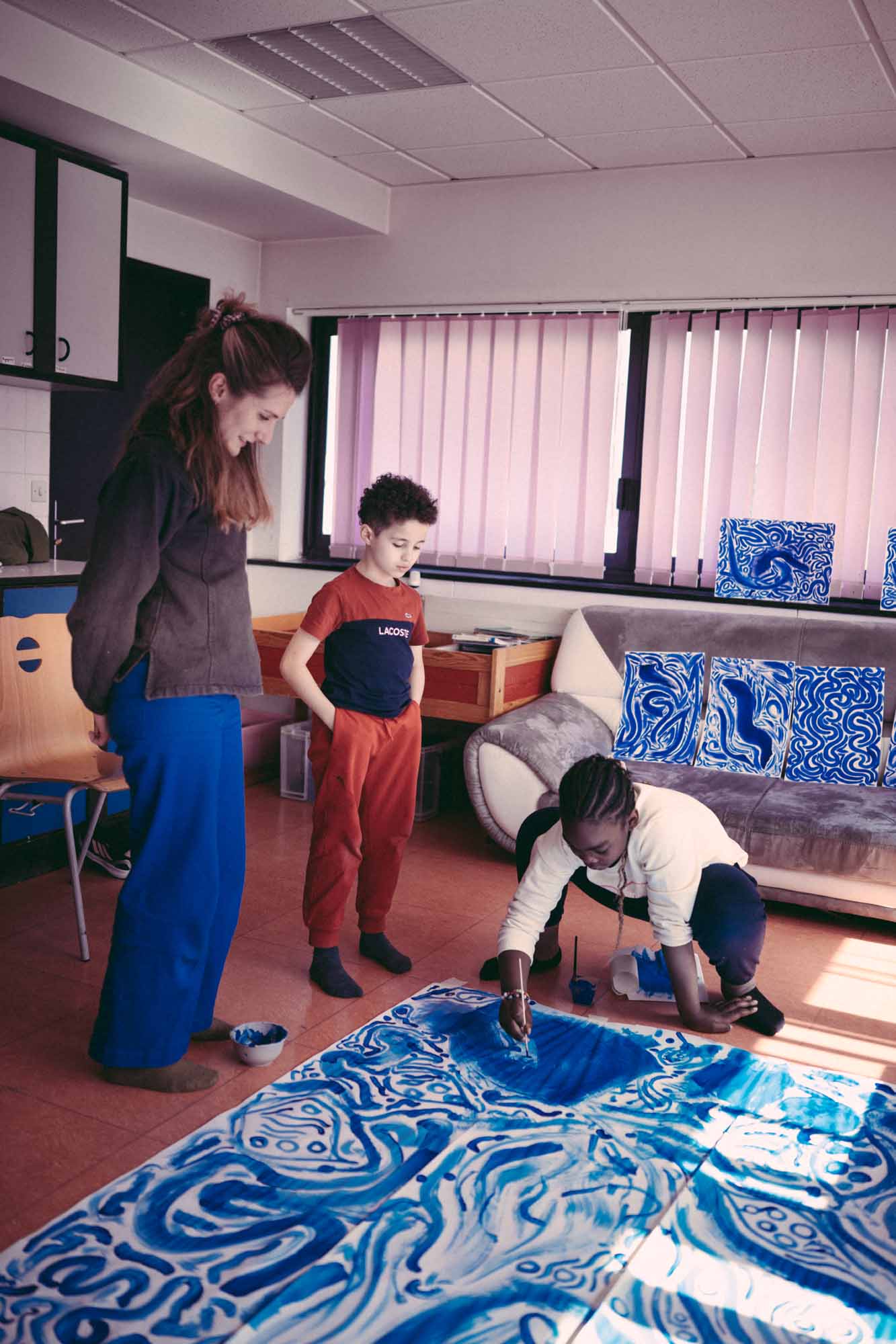 À chaque projet, elle se nourrit du lieu, des gens, des couleurs, et tisse une nouvelle peau. Une matière vivante, faite de gestes simples accumulés, qui finit par habiter l’espace au-delà de la fresque elle-même.